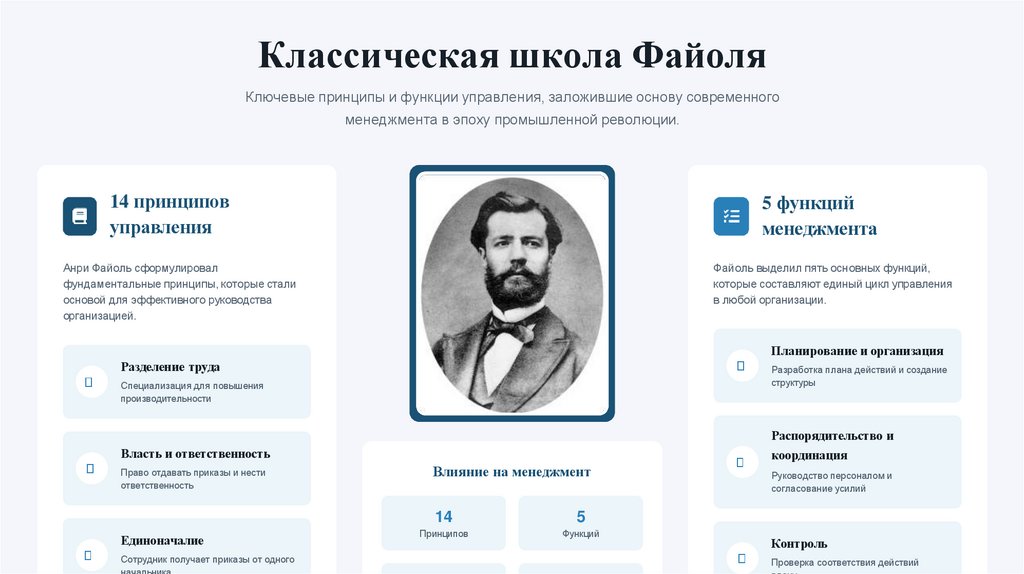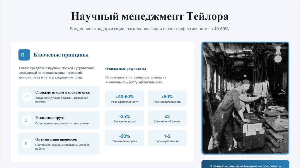 Научный менеджмент ТейлораВнедрение стандартизации, разделение задач и рост эффективности на 40-60%.