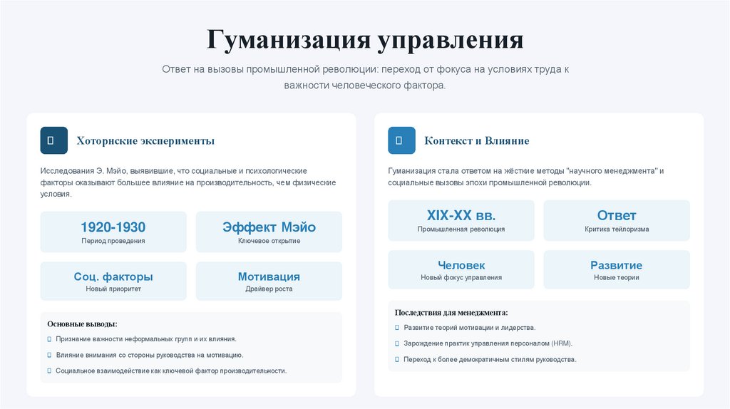 Гуманизация управленияОтвет на вызовы промышленной революции: переход от фокуса на условиях труда к