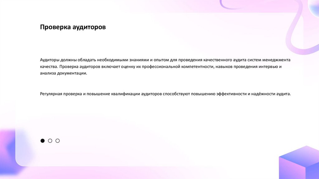 Проверка аудиторовАудиторы должны обладать необходимыми знаниями и опытом для проведения качественного аудита систем менеджмента