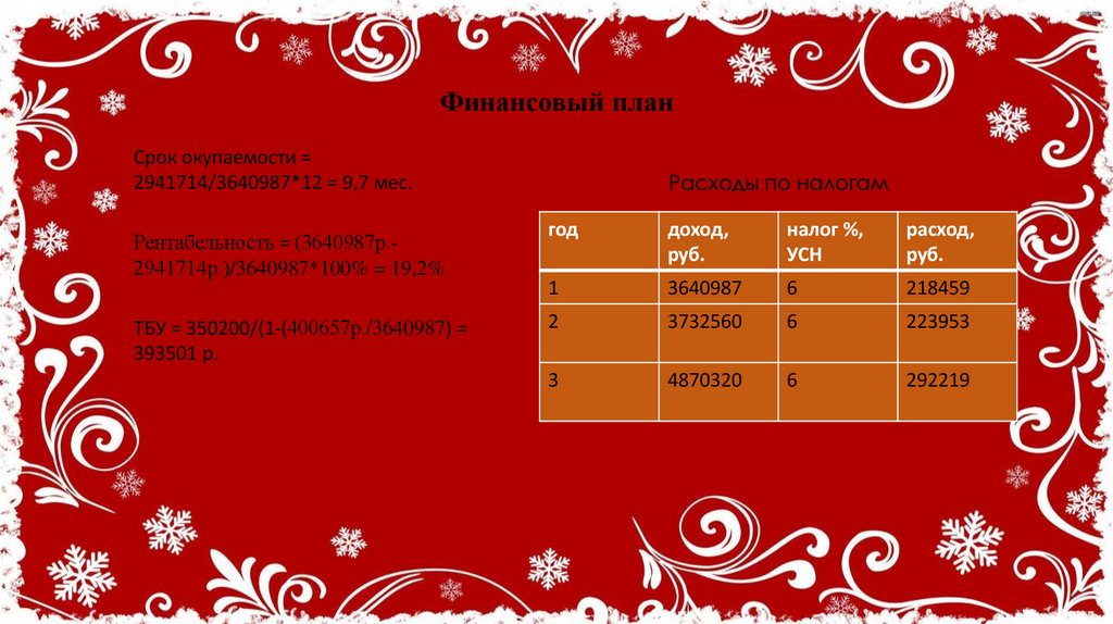 Рентабельность = (3640987р.2941714р.)/3640987*100% = 19,2%