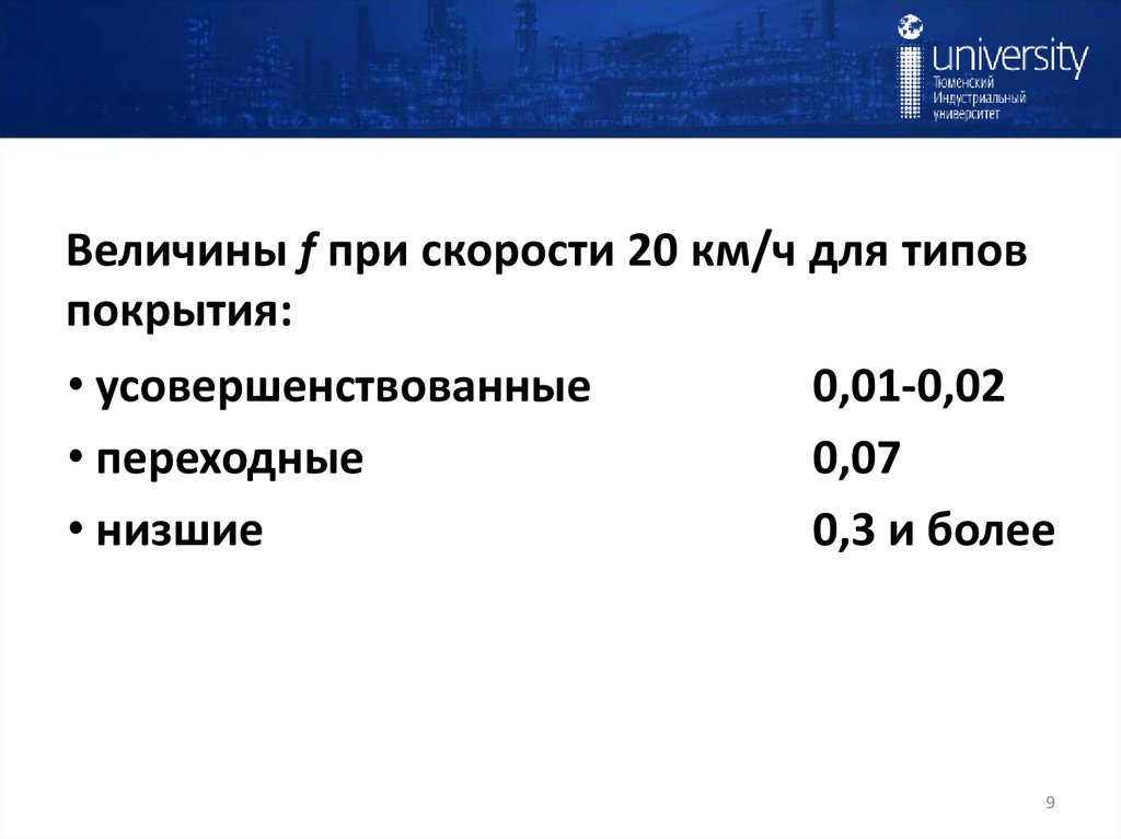 Величины f при скорости 20 км/ч для типовпокрытия: