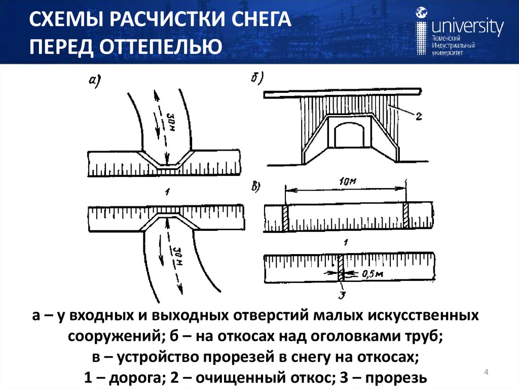 в – устройство прорезей в снегу на откосах;