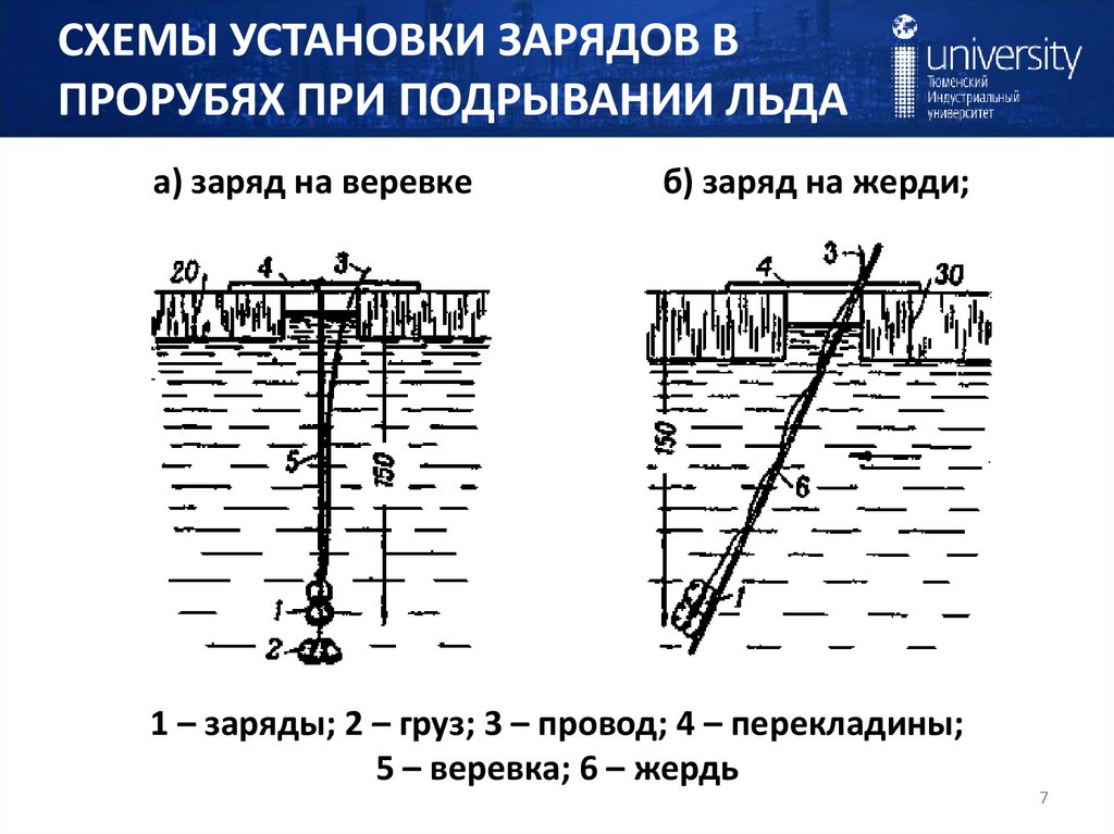 СХЕМЫ УСТАНОВКИ ЗАРЯДОВ ВПРОРУБЯХ ПРИ ПОДРЫВАНИИ ЛЬДА