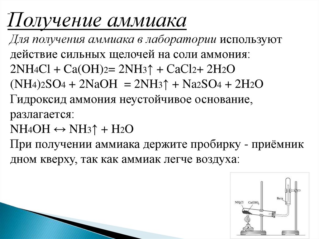 Получение аммиакаДля получения аммиака в лаборатории используют