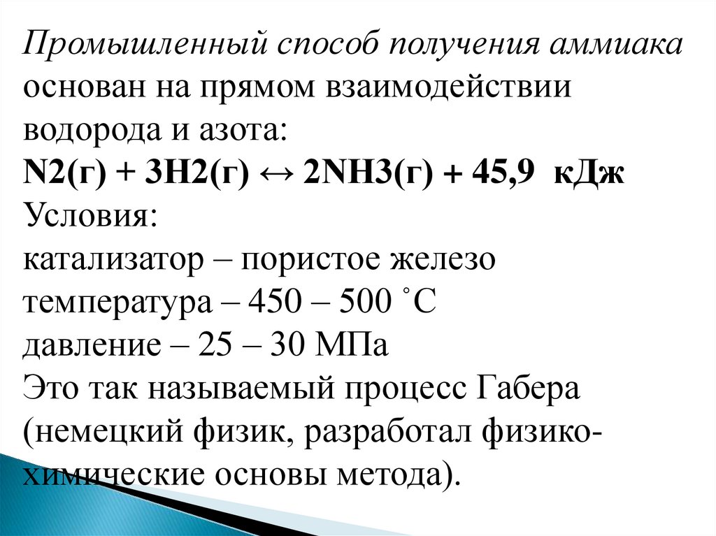 Промышленный способ получения аммиакаоснован на прямом взаимодействии