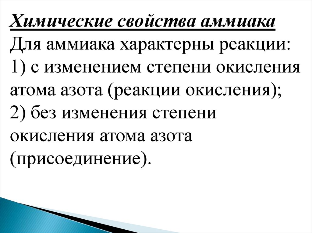 Химические свойства аммиакаДля аммиака характерны реакции: