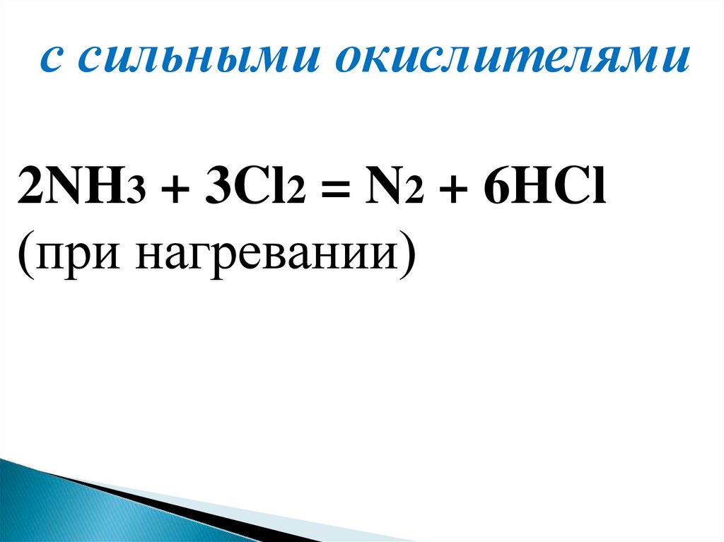 с сильными окислителями2NH3 + 3Cl2 = N2 + 6HCl