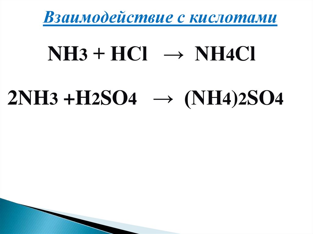 Взаимодействие с кислотамиNH3 + HCl → NH4Cl