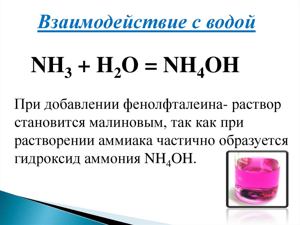 Взаимодействие с водойNH3 + H2O = NH4OH