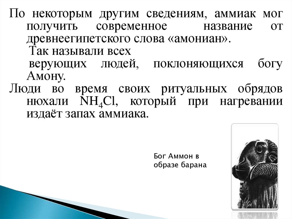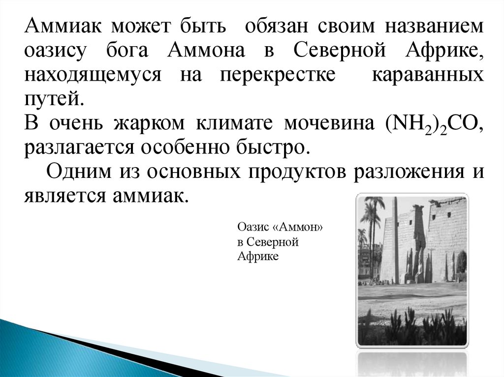 Аммиак может быть обязан своим названиемоазису бога Аммона в Северной Африке,