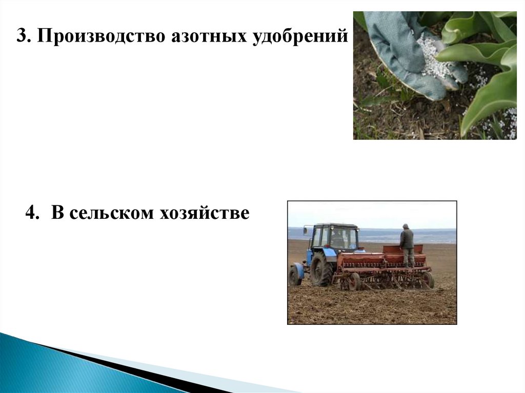 3. Производство азотных удобрений4. В сельском хозяйстве