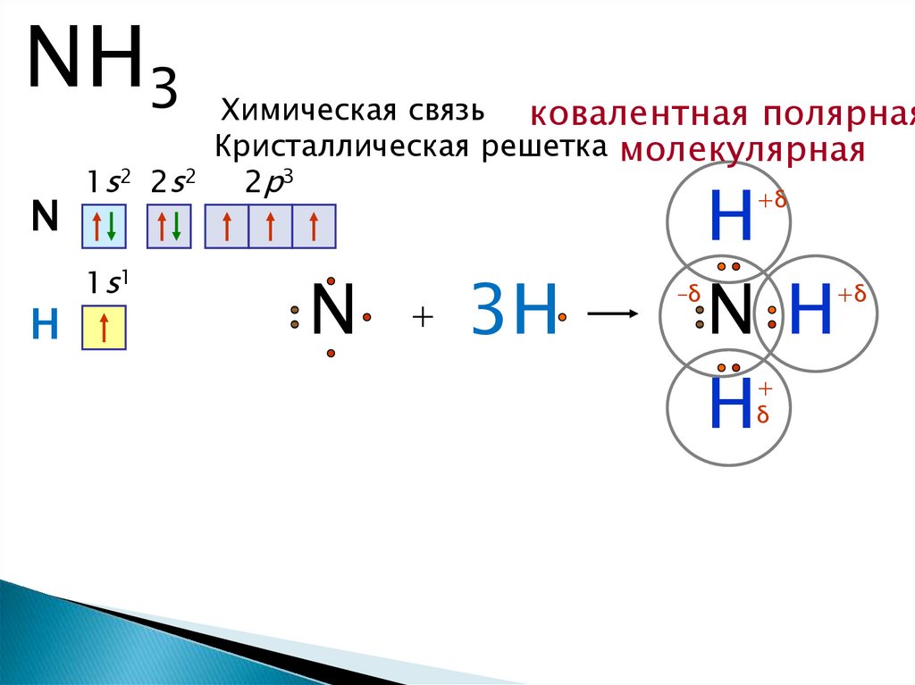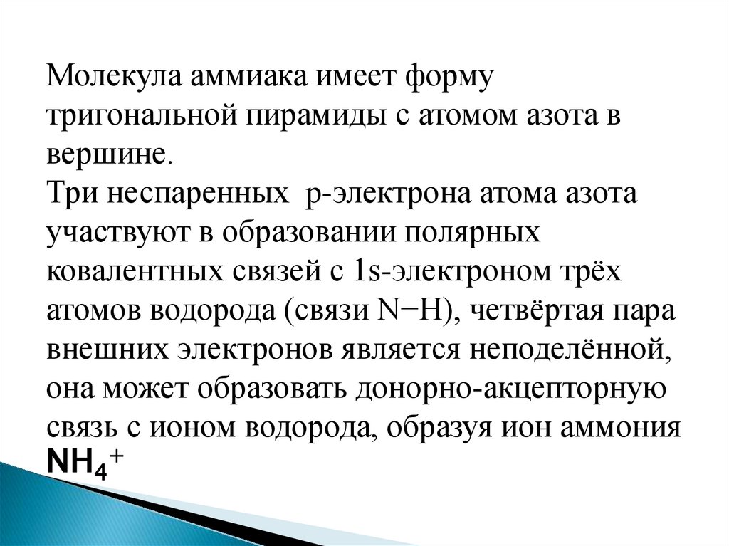 Молекула аммиака имеет формутригональной пирамиды с атомом азота в