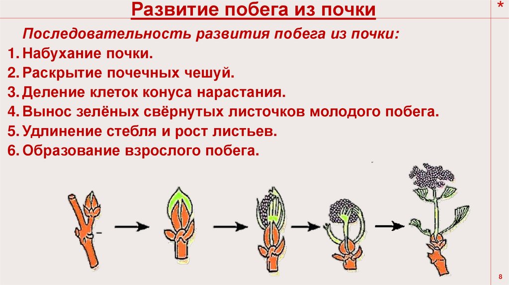 Последовательность развития побега из почки: