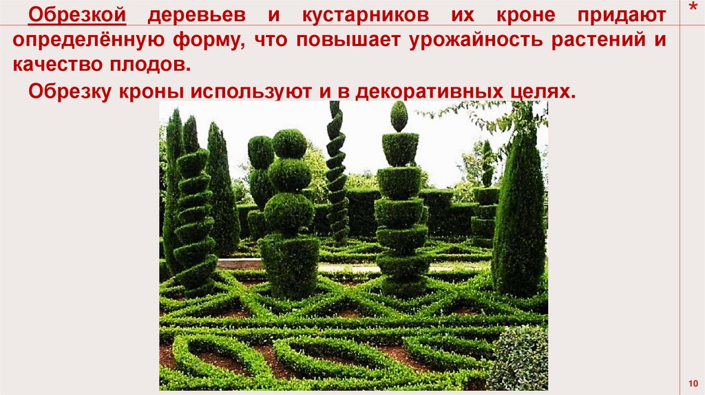 Обрезкой деревьев и кустарников их кроне придаютопределённую форму, что повышает урожайность растений и
