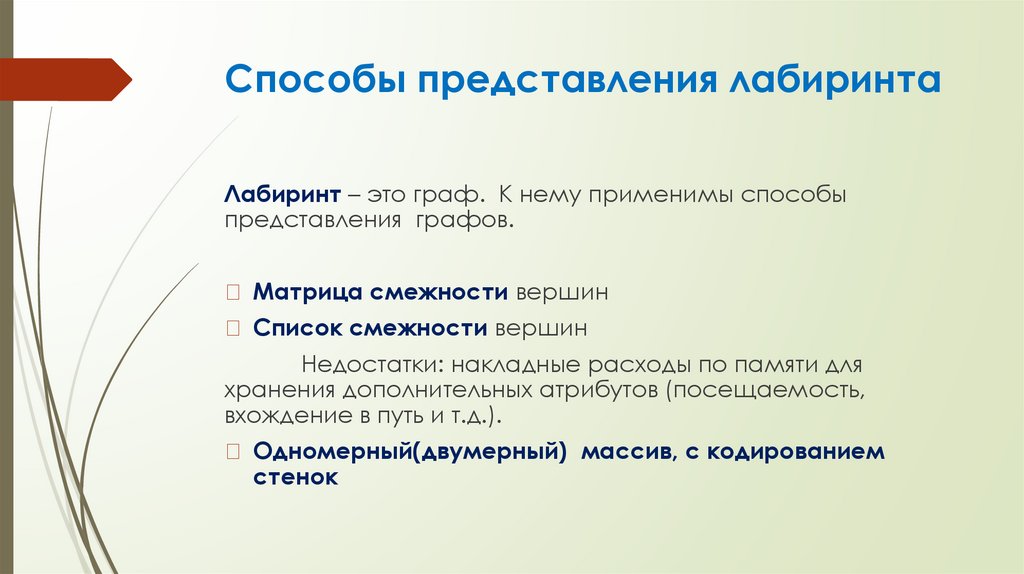 Способы представления лабиринтаЛабиринт – это граф. К нему применимы способы