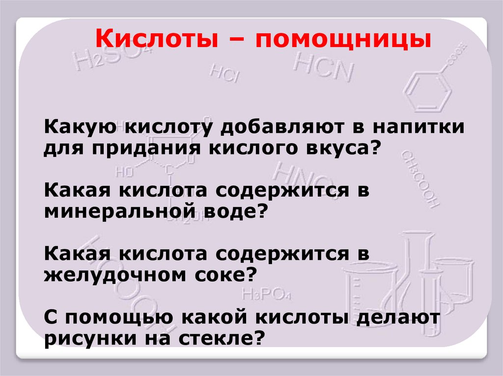 Кислоты – помощницыКакую кислоту добавляют в напитки