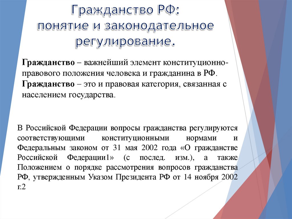 Гражданство – важнейший элемент конституционноправового положения человека и гражданина в РФ.Гражданство – это и правовая категория, связанная с