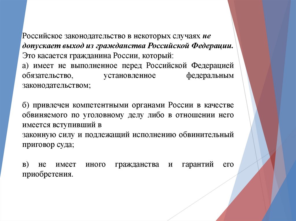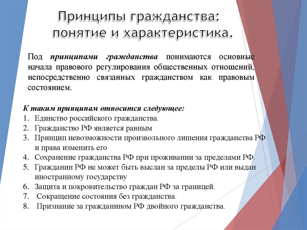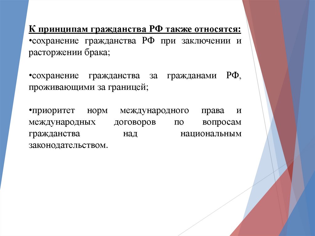 К принципам гражданства РФ также относятся:•сохранение гражданства РФ при заключении и