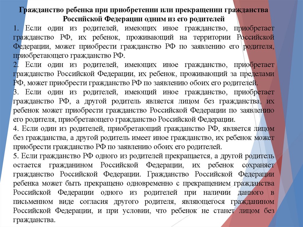 5. Если гражданство РФ одного из родителей прекращается, а другой родитель