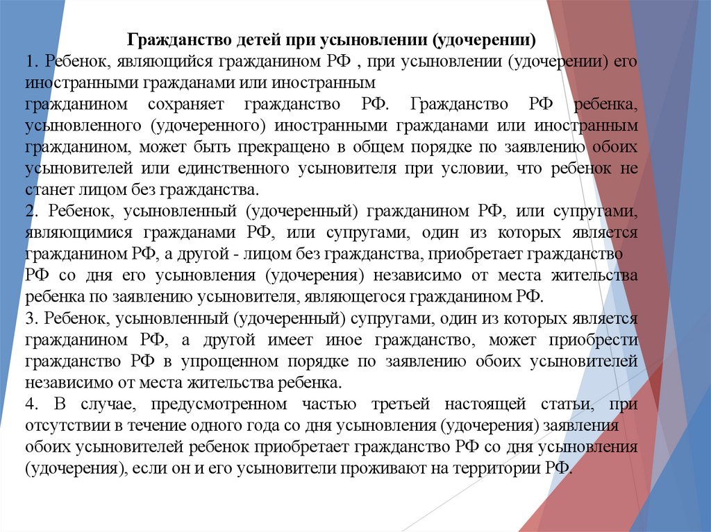 Гражданство детей при усыновлении (удочерении)1. Ребенок, являющийся гражданином РФ , при усыновлении (удочерении) его