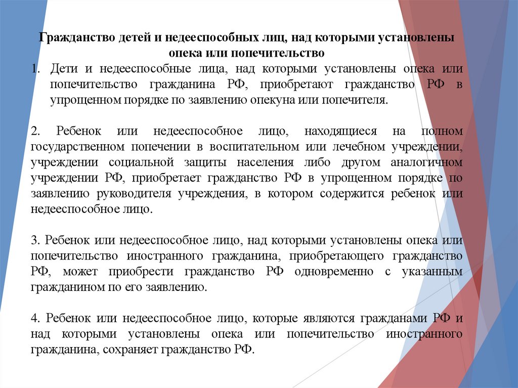Гражданство детей и недееспособных лиц, над которыми установленыопека или попечительство