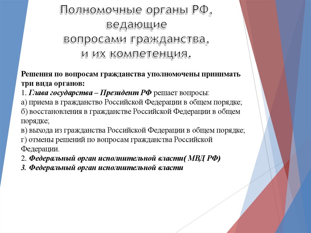 Решения по вопросам гражданства уполномочены приниматьтри вида органов: