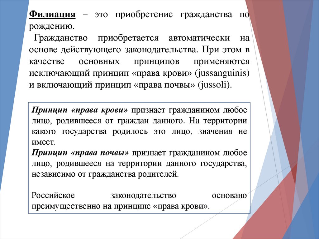 Филиация – это приобретение гражданства порождению.