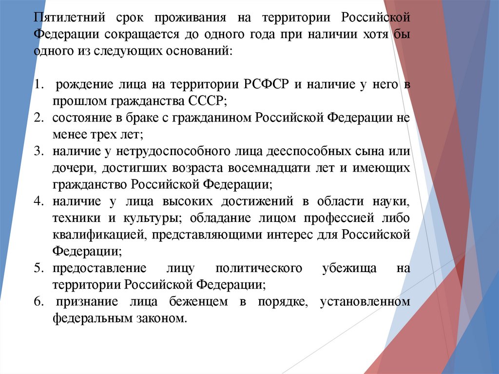 Пятилетний срок проживания на территории РоссийскойФедерации сокращается до одного года при наличии хотя бы