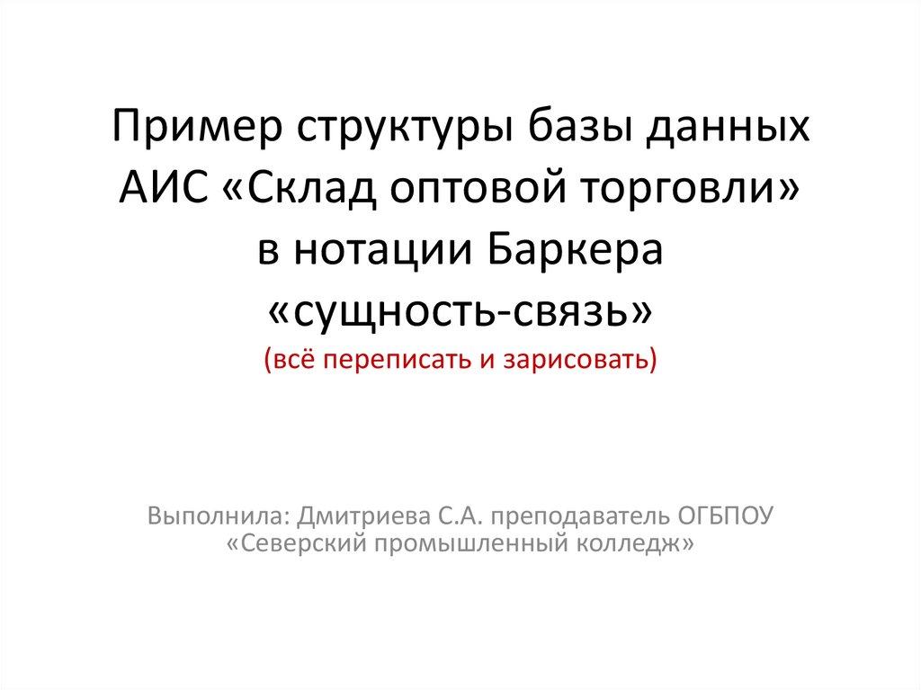 1. Пример структуры базы данных АИС «Склад оптовой торговли» в нотации Баркера «сущность-связь» (всё переписать и зарисовать)