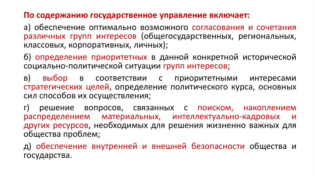 По содержанию государственное управление включает:а) обеспечение оптимально возможного согласования и сочетания