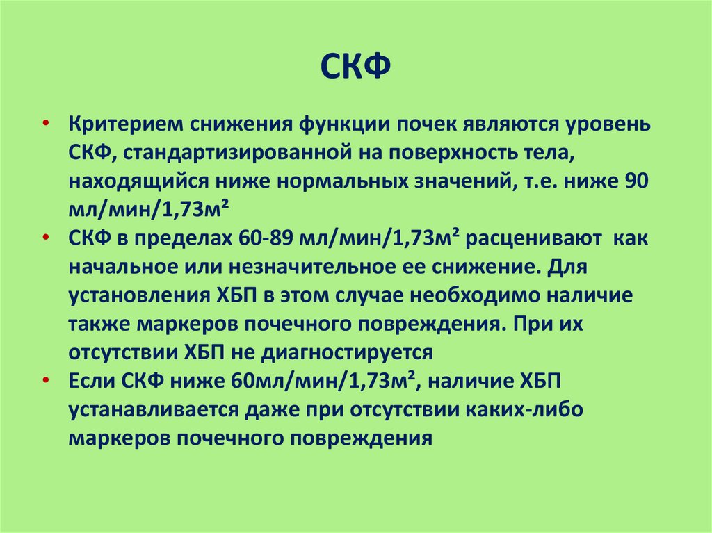 • СКФ в пределах 60-89 мл/мин/1,73м² расценивают как