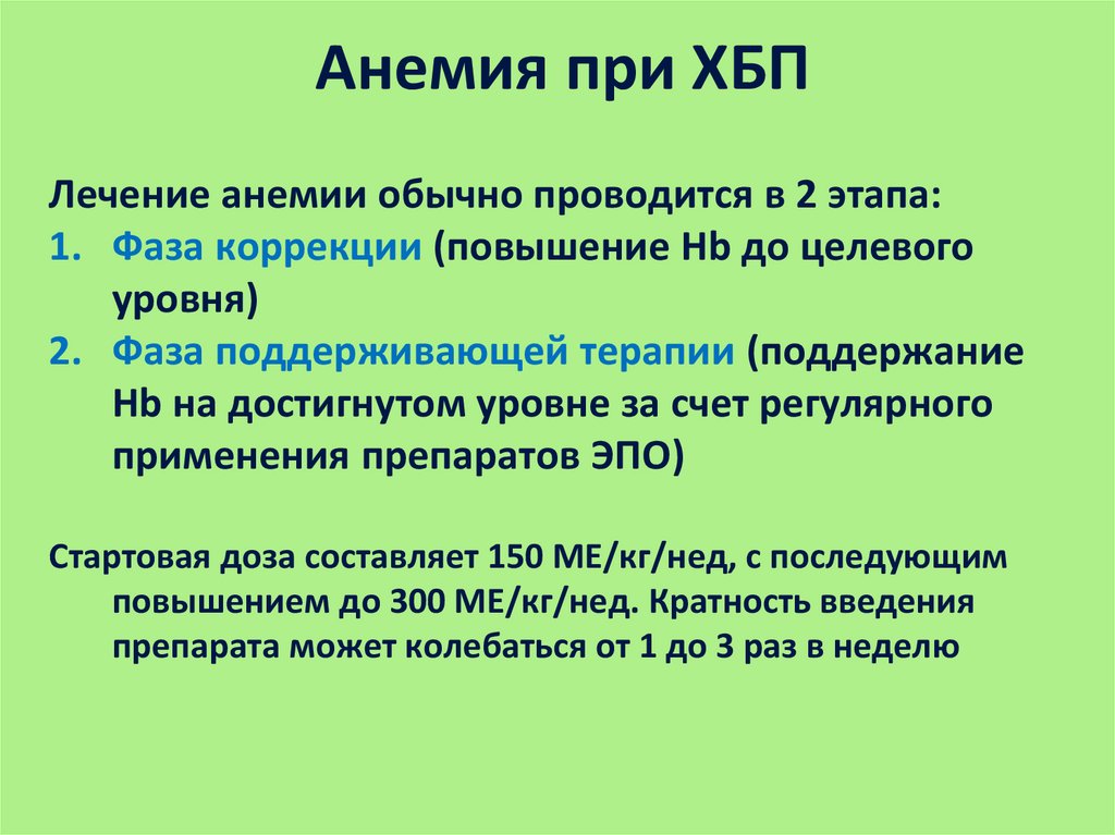 Анемия при ХБПЛечение анемии обычно проводится в 2 этапа: