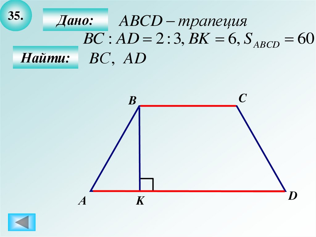 ABCD трапецияBC : AD 2 : 3, BK 6, S ABCD 60