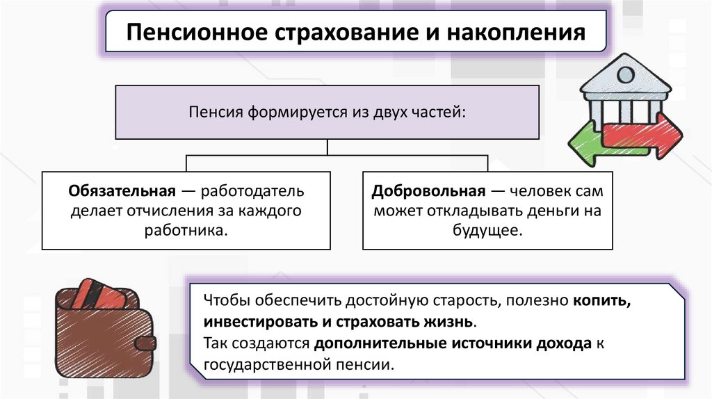 Пенсионное страхование и накопленияПенсия формируется из двух частей: