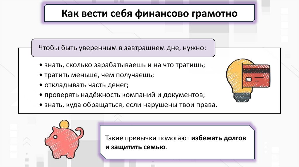 Как вести себя финансово грамотноЧтобы быть уверенным в завтрашнем дне, нужно: