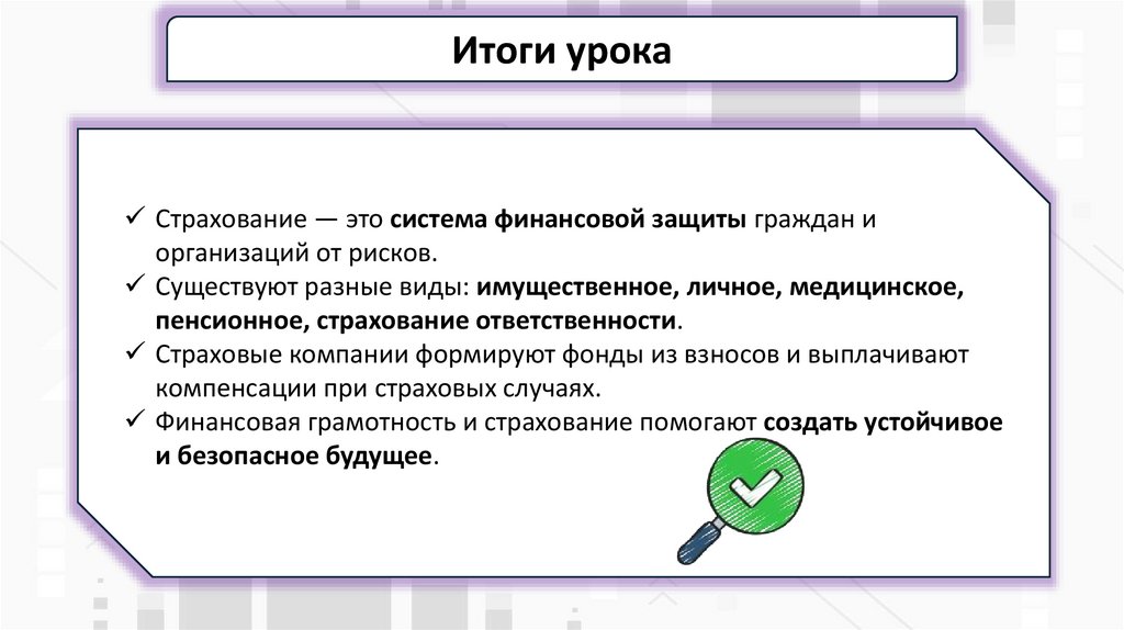 Итоги урокаСтрахование — это система финансовой защиты граждан и