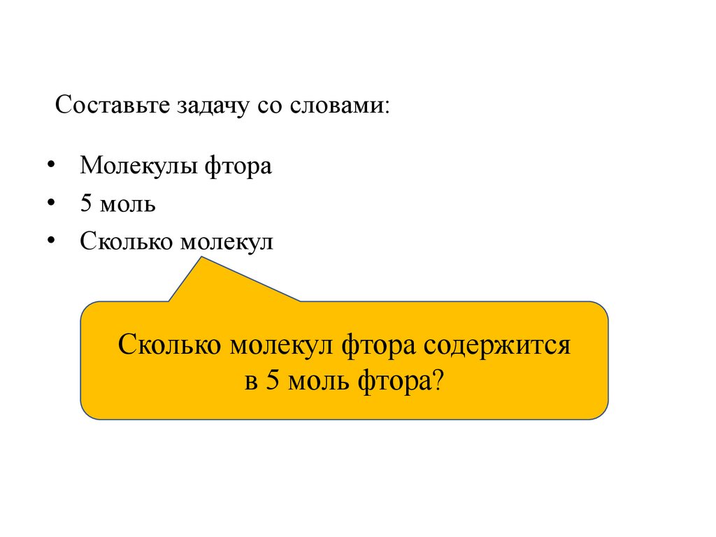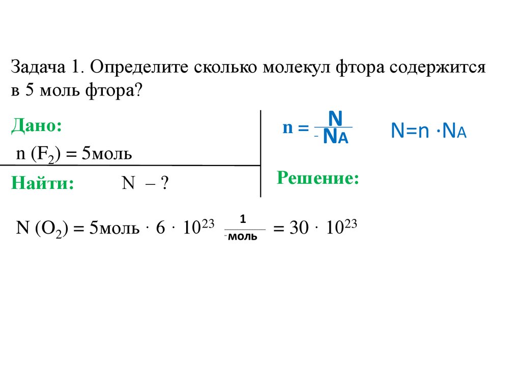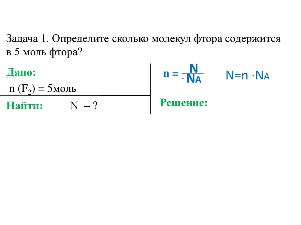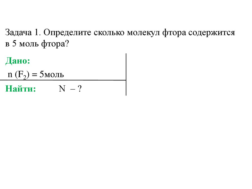 Задача 1. Определите сколько молекул фтора содержитсяв 5 моль фтора?
