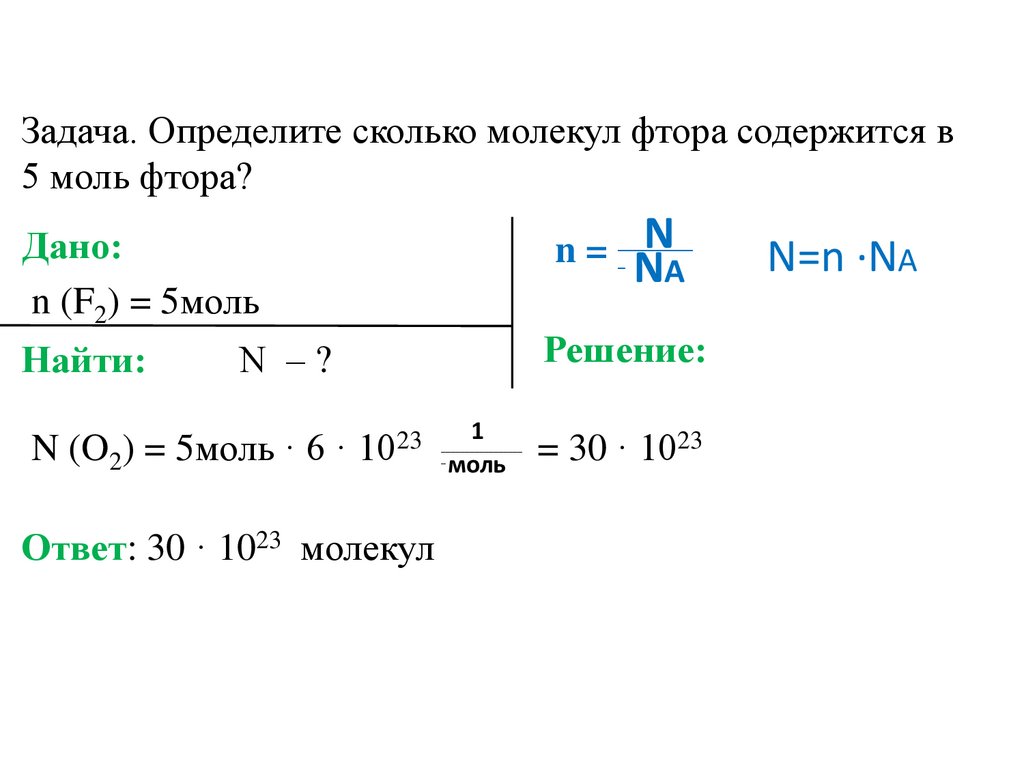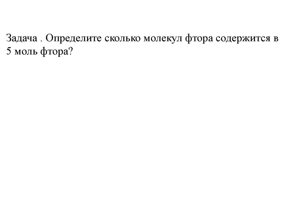 Задача. Определите сколько молекул фтора содержится в5 моль фтора?