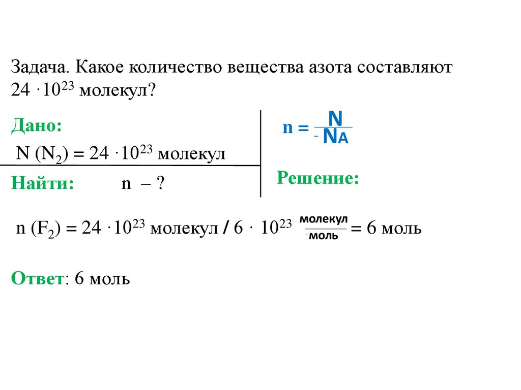 Задача. Какое количество вещества азота составляют24 ·1023 молекул?