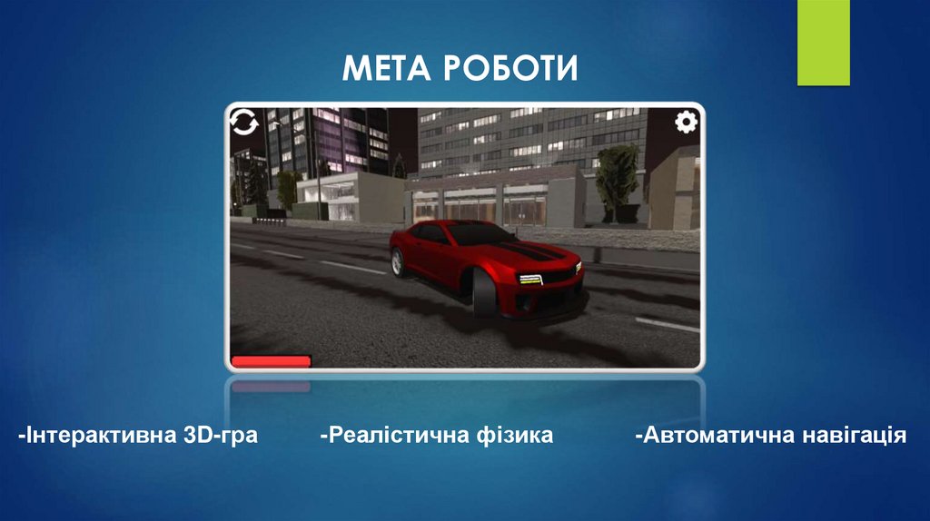 •Створено інтерактивну 3D-гру із реалістичною системою керування автомобілем тадинамічною маршрутизацією.