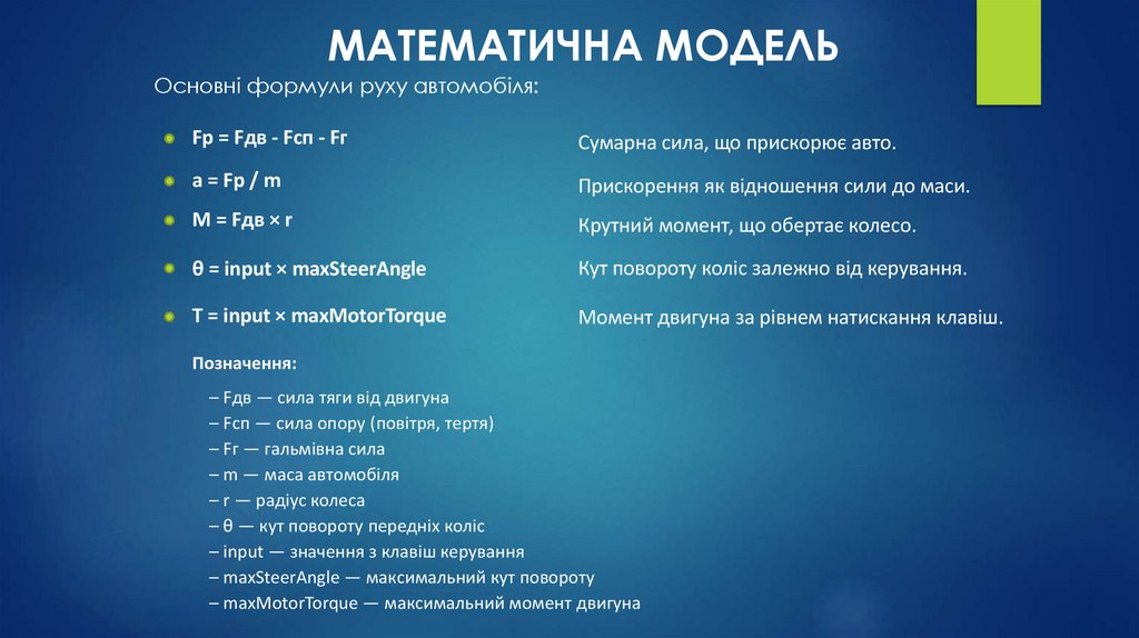 МАТЕМАТИЧНА МОДЕЛЬОсновні формули руху автомобіля: