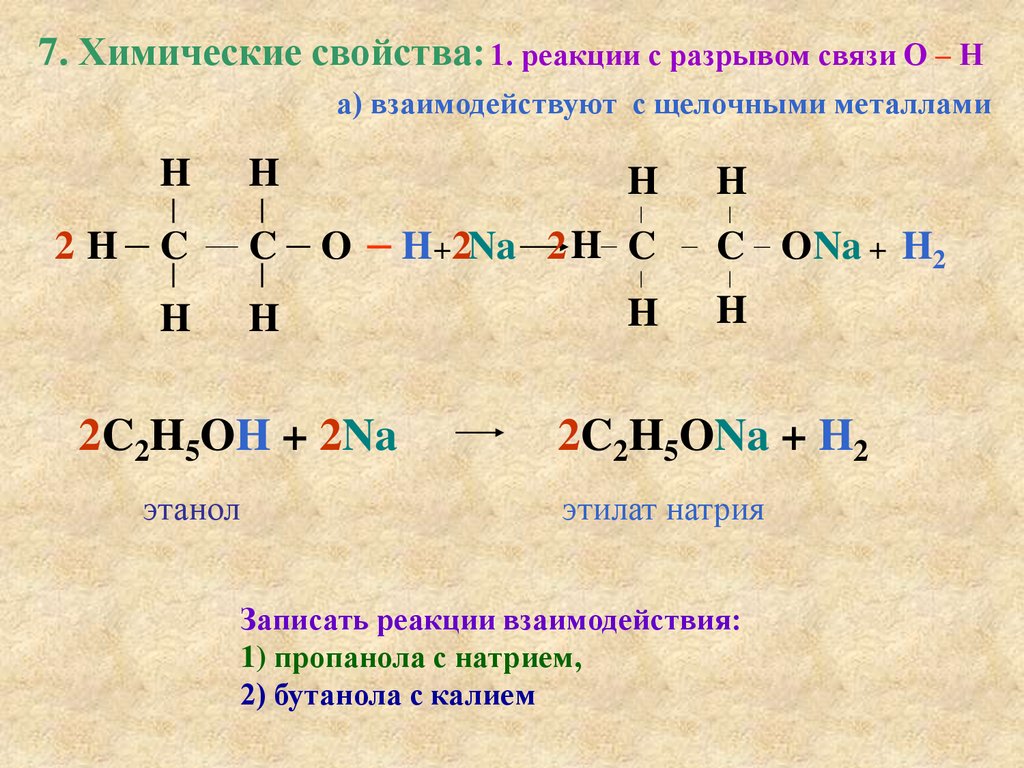 7. Химические свойства: 1. реакции с разрывом связи О – На) взаимодействуют с щелочными металлами