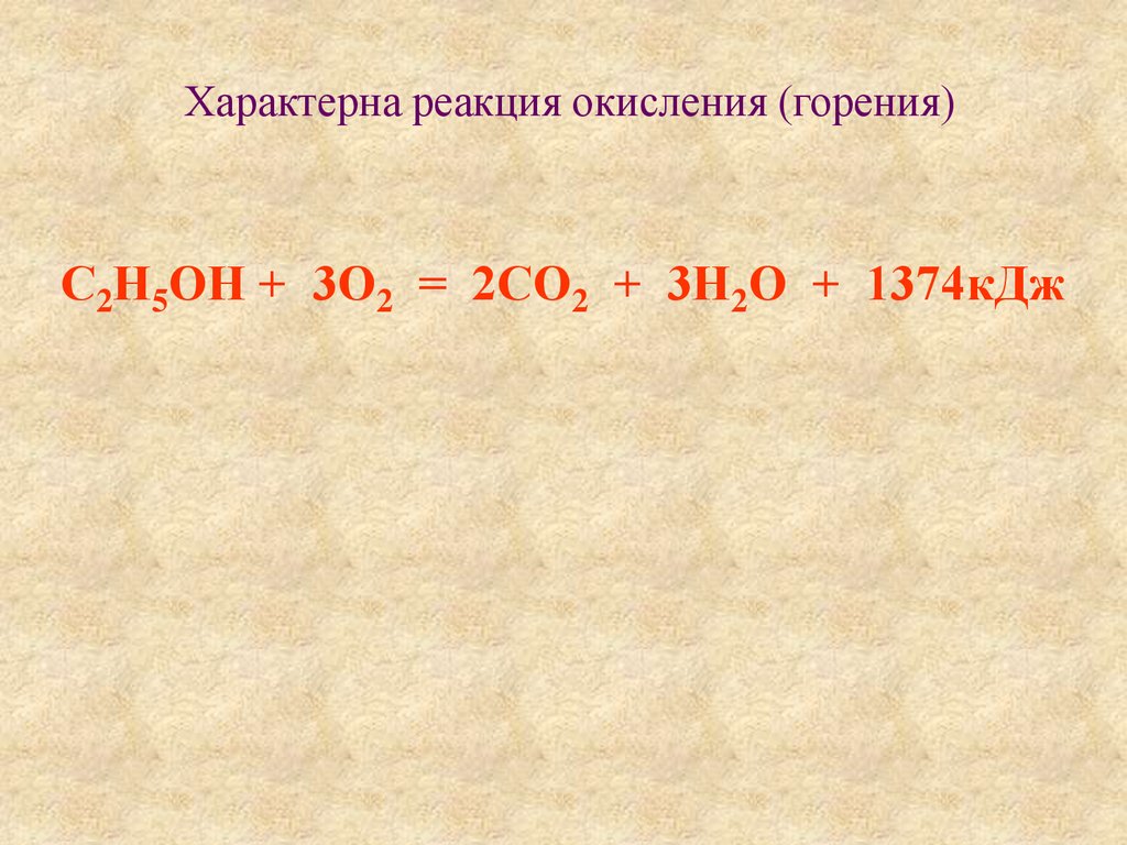 Характерна реакция окисления (горения)С2Н5ОН + 3О2 = 2СО2 + 3Н2О + 1374кДж