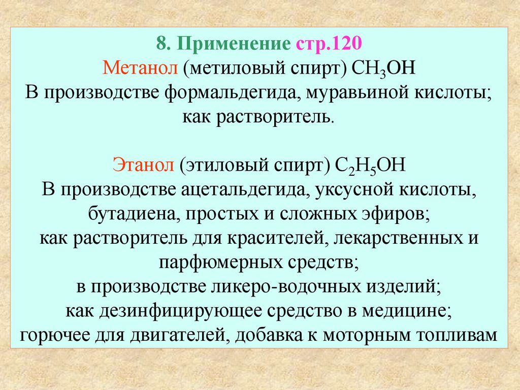 8. Применение стр.120Метанол (метиловый спирт) CH3OH