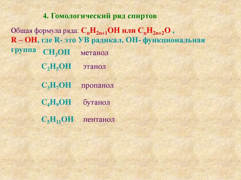 4. Гомологический ряд спиртовОбщая формула ряда: СnH2n+1OH или СnH2n+2O ,