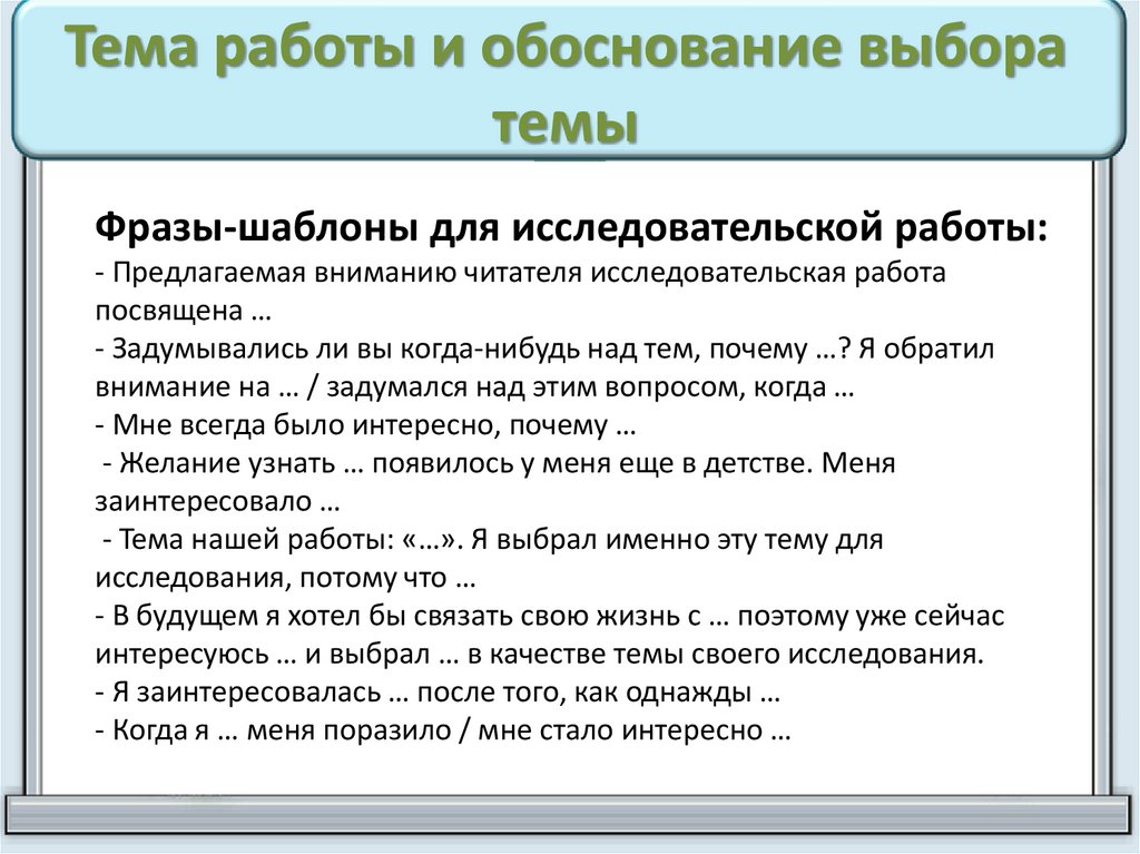 Фразы-шаблоны для исследовательской работы- Актуальность темы нашей работы определяется тем, что в настоящее