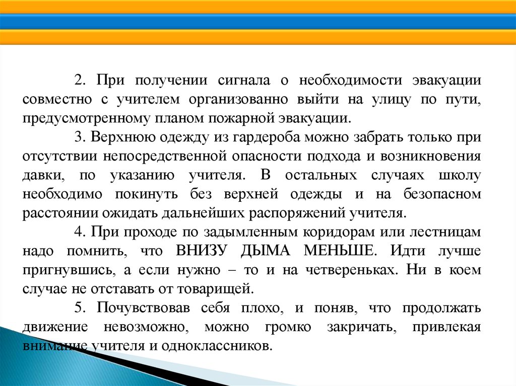 2. При получении сигнала о необходимости эвакуациисовместно с учителем организованно выйти на улицу по пути,