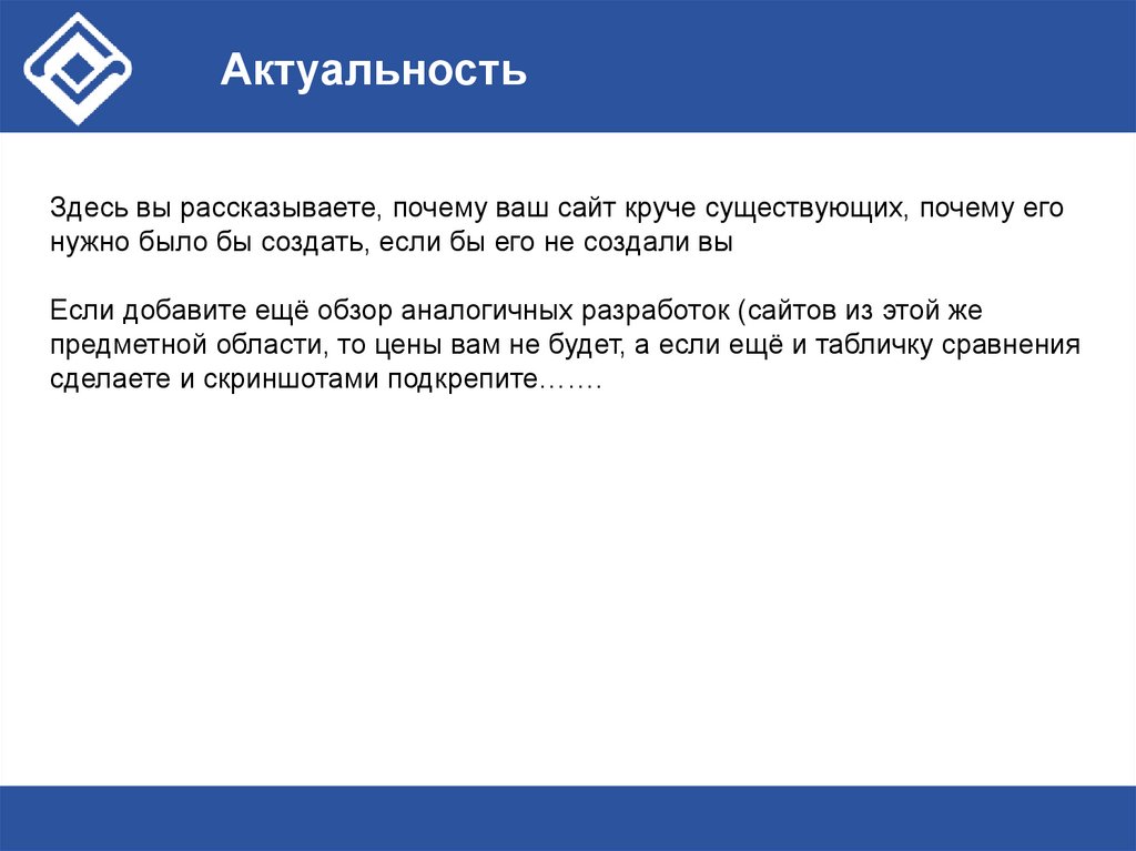 АктуальностьЗдесь вы рассказываете, почему ваш сайт круче существующих, почему его