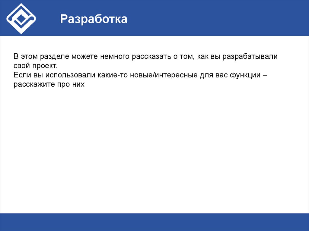 РазработкаВ этом разделе можете немного рассказать о том, как вы разрабатывали