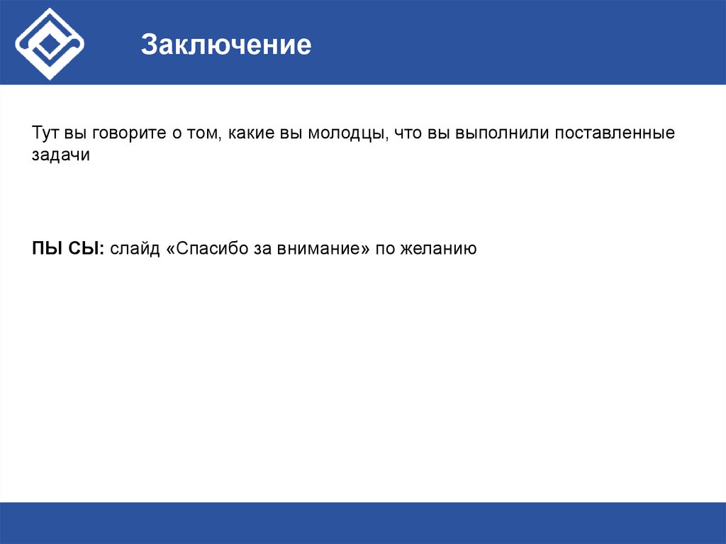 ЗаключениеТут вы говорите о том, какие вы молодцы, что вы выполнили поставленные